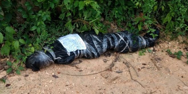 Oxkutzcab.— Agentes fuertemente armados de la Policía Municipal, SSP y FGE realizaron un operativo ayer en la mañana luego de que una persona reportó el hallazgo de un cuerpo envuelto en una bolsa negra, con un supuesto narcocartel con la leyenda: “Esto lez ba a pasar a loz zoplonez” (SIC).