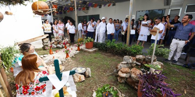 Los altares exhibieron detalles tradicionales, como una ceiba, representando el árbol sagrado en la cultura maya, además de otros elementos como la representación de las casas tradicionales mayas, así como el mucbil pollo o “pib”, además de un delicioso “xec” de frutas, dulces y bebidas típicas en la región, donde los visitantes pudieron percibir el humo del incienso y las velas que iluminan y muestran el camino a nuestros seres queridos que nos visitan en estos días.