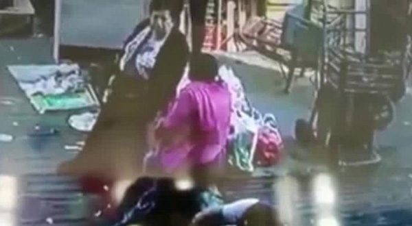 Tras el impacto, la mujer que platicaba con la víctima intenta ayudarla, y otros comerciantes se acercan para intentar sacar a la víctima.