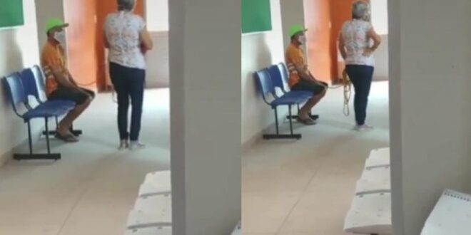 En un video viral en la plataforma de TikTok, compartido por la cuenta Portal Polémico, se puede ver como un hombre permanece sentado en una sala de espera, mientras es sostenido por una soga de la mano de una mujer, quien según es su esposa.
