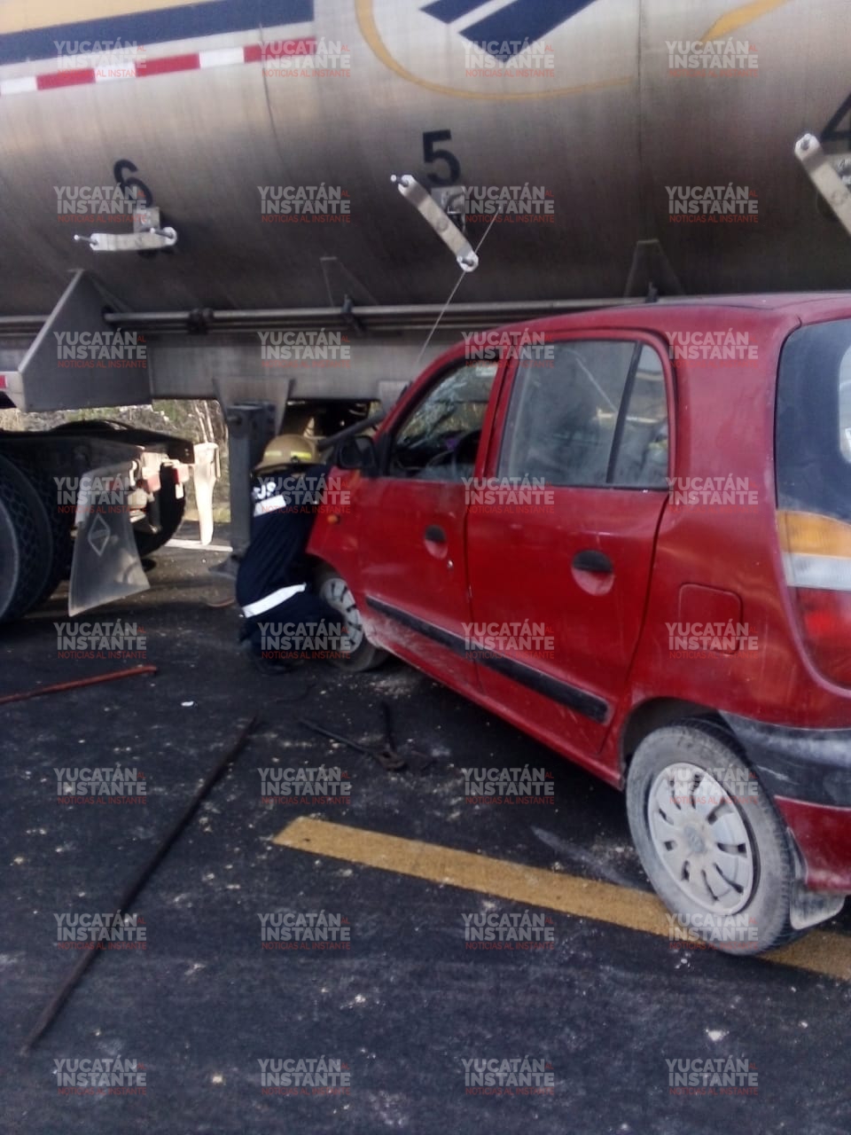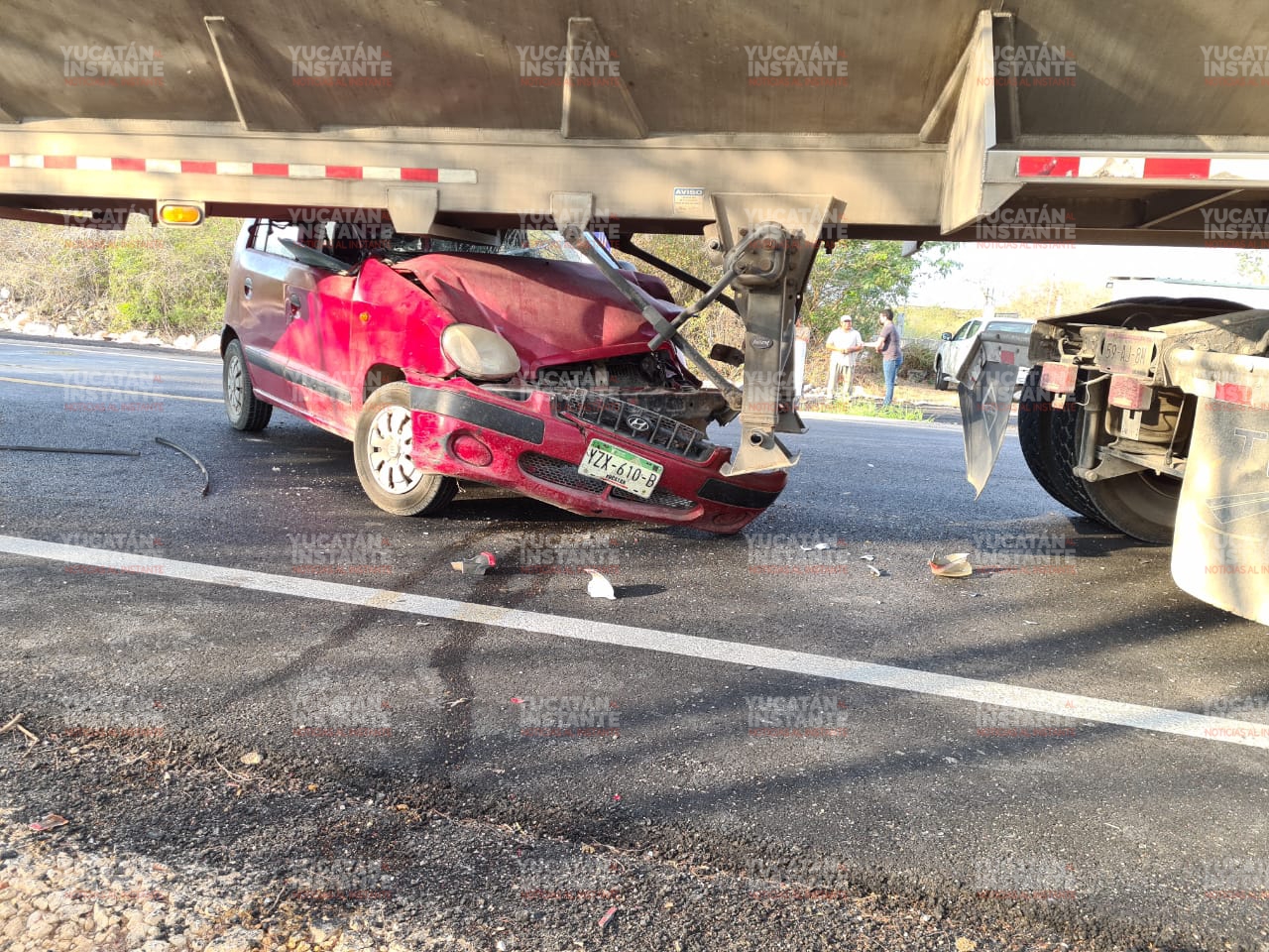 Los hechos ocurrieron ayer martes cuando la conductora de un Hyundai Atos color rojo circulaba de poniente a oriente, en la mencionada vía rumbo a Hunucmá, justo detrás de un tractocamión con tolva.