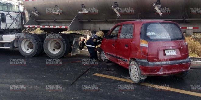Los hechos ocurrieron ayer martes cuando la conductora de un Hyundai Atos color rojo circulaba de poniente a oriente, en la mencionada vía rumbo a Hunucmá, justo detrás de un tractocamión con tolva.