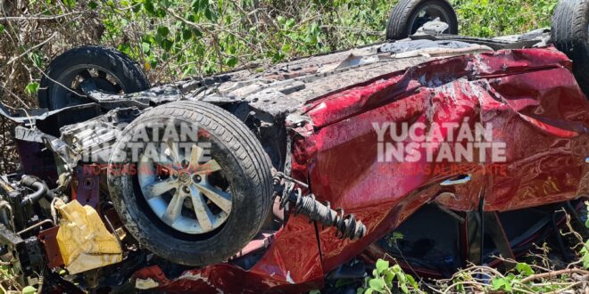 Kinchil, Yuc., 18 de abril 2022.- Una familia de turistas que iban a bordo de un vehículo Sentra, sufrieron una dramática volcadura la tarde de ayer, luego de que la guiadora “pellizcara” el borde de la carretera Kinchil-Celestún, justo a la altura del kilómetro 64.