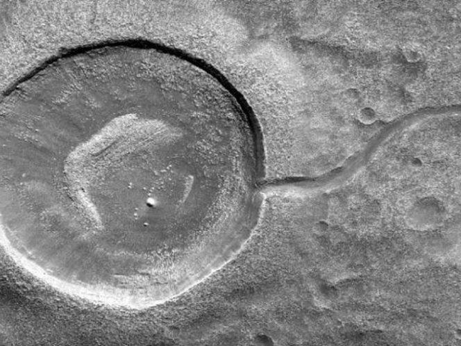 La NASA dio a conocer una imagen tomada por el Orbitador de Reconocimiento de Marte (MRO, por sus siglas en inglés), que muestra un cráter de impacto, el cual parece un renacuajo tallado por el agua que lo abastecía.