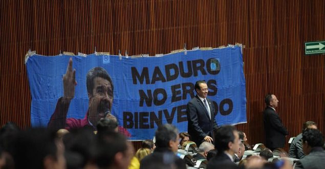 En la Cámara de Diputados, legisladores del blanquiazul colocaron una manta con la frase “Maduro no eres bienvenido”, frase que también ha sido utilizada como hashtag en las redes sociales para manifestar el desacuerdo por la visita del presidente de Venezuela.