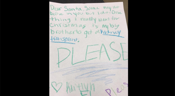 “Querido Santa, algunos tal vez no crean en ti, pero yo sí. Algo que realmente quiero para Navidad es un trasplante de riñón para mi hermano”, se lee en la carta.
