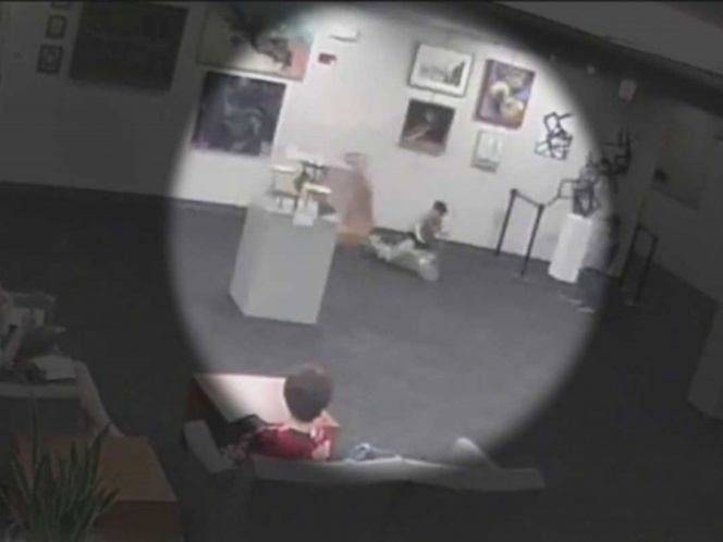 El video de vigilancia capturó a su hijo de 5 años abrazando una escultura en exhibición antes de que se volcara sobre él. Luchó un poco por detenerla, pero le fue imposible, pues de repente cayó al suelo.