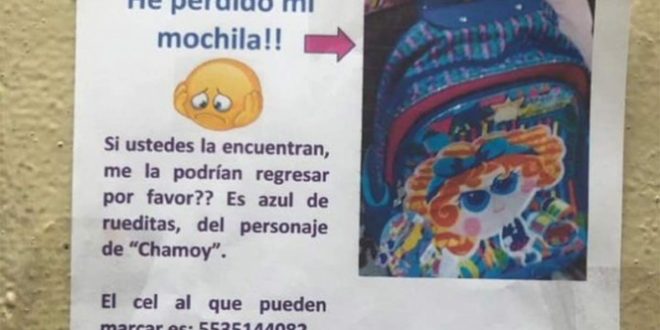Ayuda. S.O.S. Un pequeño perdió su mochila. Un emoticón con cara de preocupación acompaña la alerta que empieza a viralizarse en redes sociales.
