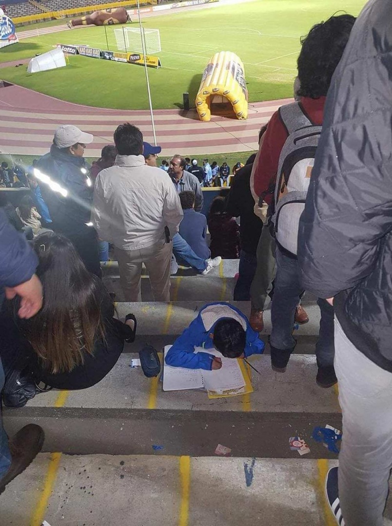 El menor, identificado como Kevin Ariel Núñez, de 10 años, asistió al estadio aún sabiendo que tenía que hacer sus deberes escolares, por lo que decidió, para no dejar de hacer una de las dos cosas, llevárselos al Estadio Olímpico Atahualpa y hacerlos mientras veía el encuentro.