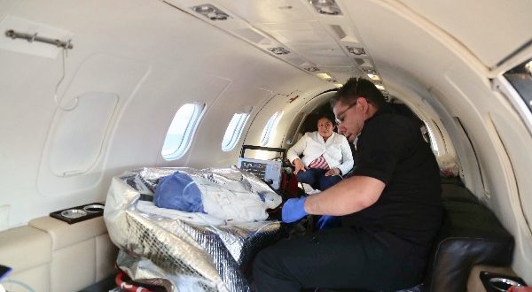 Para el traslado, arribó al aeropuerto internacional de esta ciudad “Manuel Crescencio Rejón” la ambulancia aérea con matrícula XA-UUW, la cual partió alrededor de las 17:15 horas con rumbo a la mencionada urbe texana.