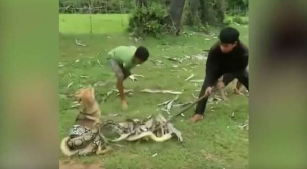 Tres niños recurren a piedras y palos para salvar a un perro que ha sido enroscado por una enorme serpiente. Cuando las piedras no son suficientes, los menores se arman de valor para sostener a la serpiente con sus propias manos, permitiendo que la mascota se escape.