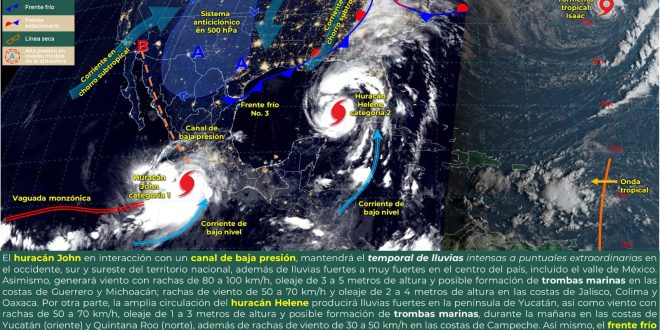 circulación del huracán “Helene”, que se ubica sobre el golfo de México como huracán de categoría 2, mientras se dirige hacia el sureste de Estados Unidos. Ambiente caluroso a muy caluroso durante el día y cálido en la noche. Vientos del oeste de 15 a 25 km/h, con rachas