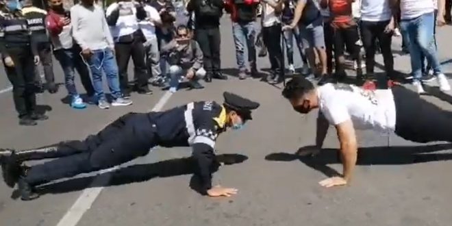 En redes sociales, circula el momento en el que un policía vence a uno de los manifestantes. ¡Y logra hacer más lagartijas que él!