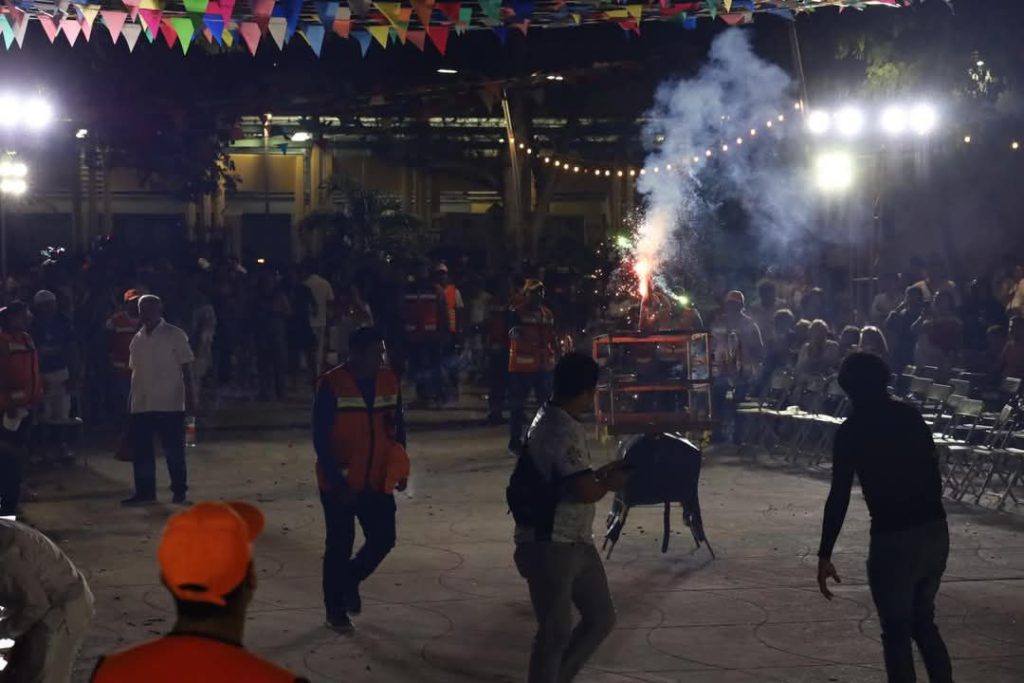 La velada también estuvo marcada por la comicidad del actor regional Ismael Salazar, mejor conocido como “Mactá”, quien arrancó risas y aplausos del público. Como es tradición, en el intermedio se realizó la quema del Torito de Petate, un espectáculo que se llevó a cabo sin contratiempos y que cautivó a los presentes.