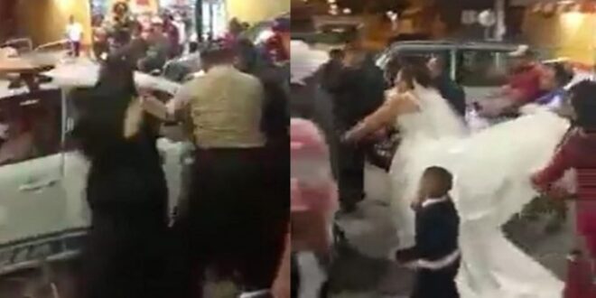 En los videos que circulan en las redes sociales es posible apreciar el momento en que la novia comenzó a llorar, mientras una mujer de vestido rojo hizo varios intentos para impedir el arresto, sin éxito.