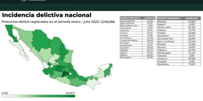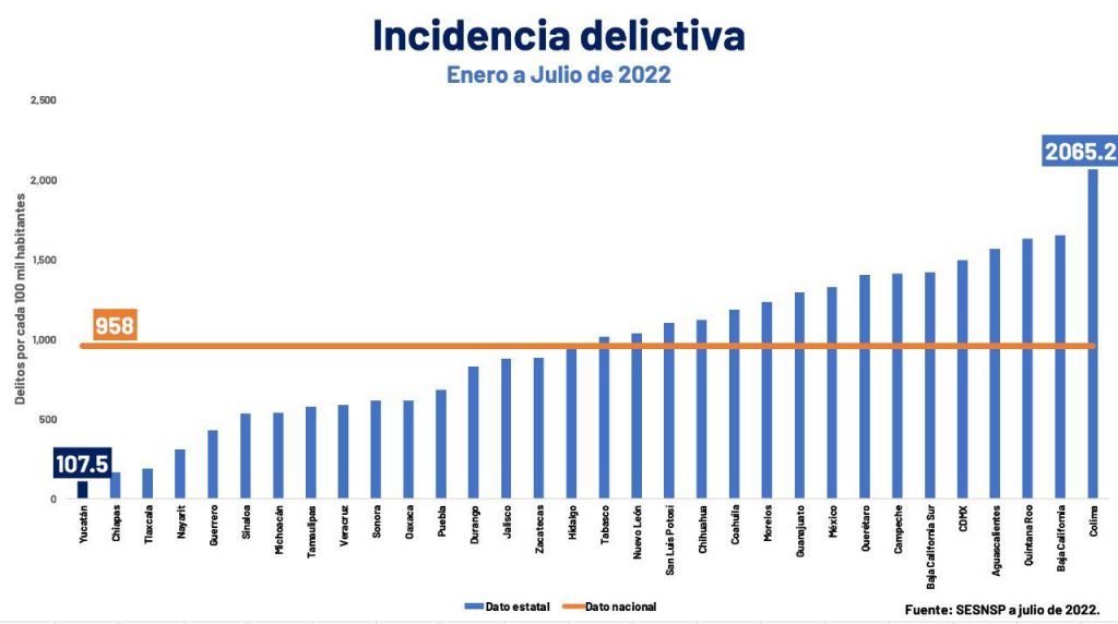 De acuerdo con el reporte de Incidencia delictiva del Sesnsp correspondiente al mes de julio, indica que, durante el periodo de enero a julio de este año, Yucatán se posicionó en el primer lugar con menor incidencia delictiva al registrar una tasa de 107.52 delitos por cada 100 mil habitantes, cifra que es más de 8 veces menor a la registrada a nivel nacional que es de 958.02, lo que significa una disminución de -62.5% en los casos al pasar de 6,626 delitos en 2021 a 2,482 en 2022.