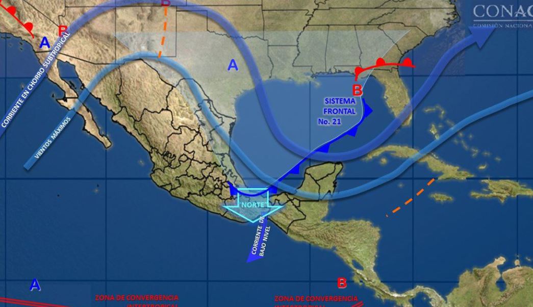 Se esperan rachas de viento superiores a 60 kilómetros por hora (km/h) y posibles tolvaneras en Baja California y Sonora, en tanto que en el Istmo y el Golfo de Tehuantepec la masa de aire polar del sistema frontal 21 mantendrá el evento de norte con rachas superiores a 60 km/h.