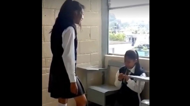 En un video que circula en redes sociales se escucha a una niña decirle a otra compañera arrodillada: “Que todos te escuchen ¡Órale, hazlo¡”; mientras tanto, al fondo se pueden escuchar risas y burlas de otros alumnos.