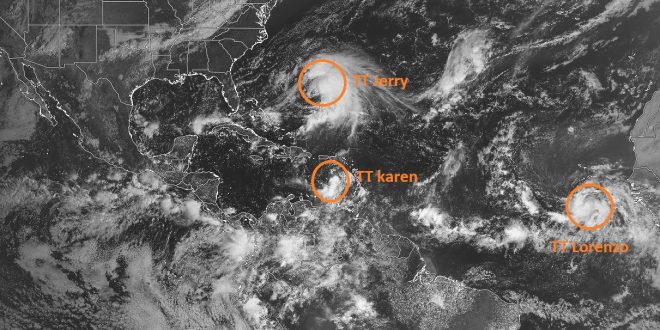Por segunda ocasión en lo que va de la temporada de ciclones tropicales 2019, esta mañana de lunes tenemos en el Océano Atlántico tres sistemas tropicales con nombre activos de manera simultánea: las tormentas tropicales Jerry, Karen y Lorenzo, informa el OCPY de la Conagua.