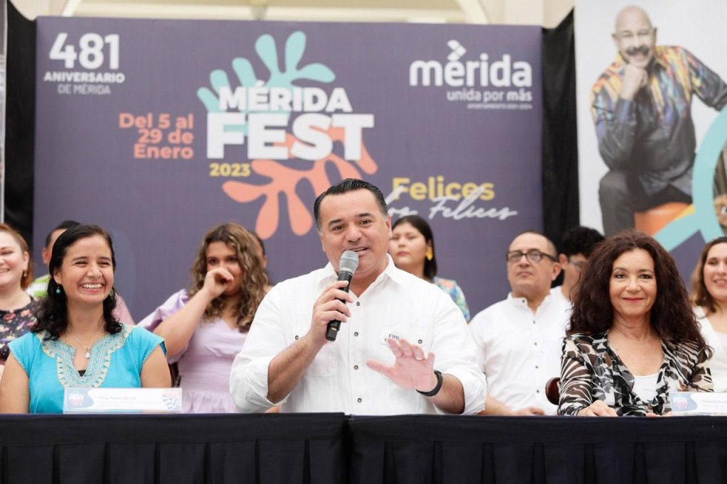 Mérida, Yucatán a 21 de diciembre de 2022.- En el 481 aniversario de la ciudad se celebrará el “Mérida Fest: Felices los Felices” que tendrá una amplia oferta cultural, gastronómica y artística, dirigida para todas familias y visitantes que nos acompañarán del 5 al 29 de enero de 2023 a disfrutar en armonía los más de 768 artistas locales e internacionales que estarán en escena, informó el Alcalde Renán Barrera Concha.