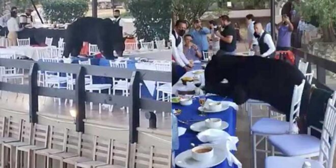 Esto debido a que durante un evento privado un oso salvaje y hambriento se apareció y comenzó a degustar de los alimentos servidos en una mesa, acto seguido, los comensales empezaron a grabar al animal comiendo de los platos.