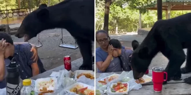 Un oso 🐻 se comió los tacos y enchiladas de una familia en el parque Chipinque en San Pedro Garza García, #NuevoLeón. Mientras se daba tremendo banquete, se ve como una mujer y un niño conservan la calma en todo momento.