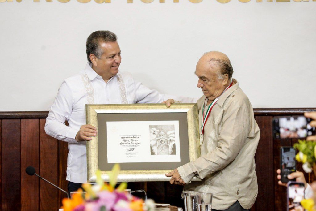 Mérida, Yucatán 12 de agosto de 2024.- En reconocimiento al maestro Tomás Ceballos Campos por sus 60 años de experiencia en la escena teatral, el Alcalde Alejandro Ruz Castro le entregó la medalla Héctor Herrera “Cholo” 2024, presea con la que se distingue a mujeres y hombres que con sus obras, trayectoria y aportaciones, enaltecen al teatro regional yucateco.