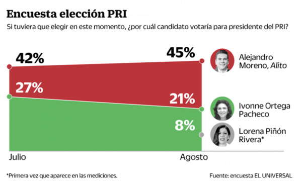 A menos de una semana de la jornada electiva y a la pregunta “Si tuviera que decidir en este momento ¿por cuál candidato votaría para presidente del PRI?, 45 por ciento respondió que por Alito en tanto que 21 por ciento dijo que lo haría por Ivonne Ortega Pacheco. En el tercer lugar queda la veracruzana Lorena Piñón Rivera.
