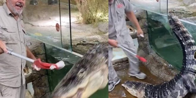 Uno de los más recientes videos que compartieron en su cuenta de Instagram llamó la atención puesto que dejó ver cómo un cuidador del zoo casi es atacado por un cocodrilo cuando estaba alimentándolo; y es que por medio de un palo de madera le entregó un gran trozo de carne.
