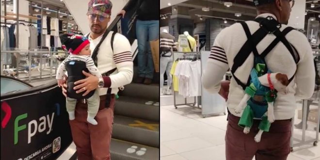 Me dijo: amor, ví un canguro para nuestro bebé MILO (su perrito) y le dije pues no se diga más y, ahí lo tienen, como un buen papá”.