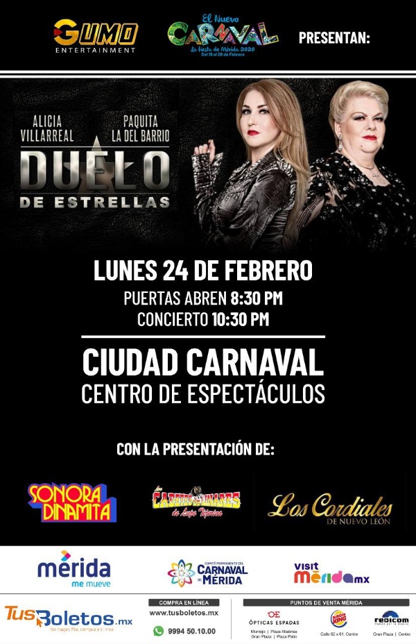 Mérida, Yucatán, a 05 de febrero de 2020 (Boletín).- Un mano a mano entre Paquita la del Barrio y Alicia Villareal será el cuarto concierto del Carnaval de Merida 2020, el lunes 24 de febrero en el Centro de Espectáculos Montejo en Ciudad Carnaval.