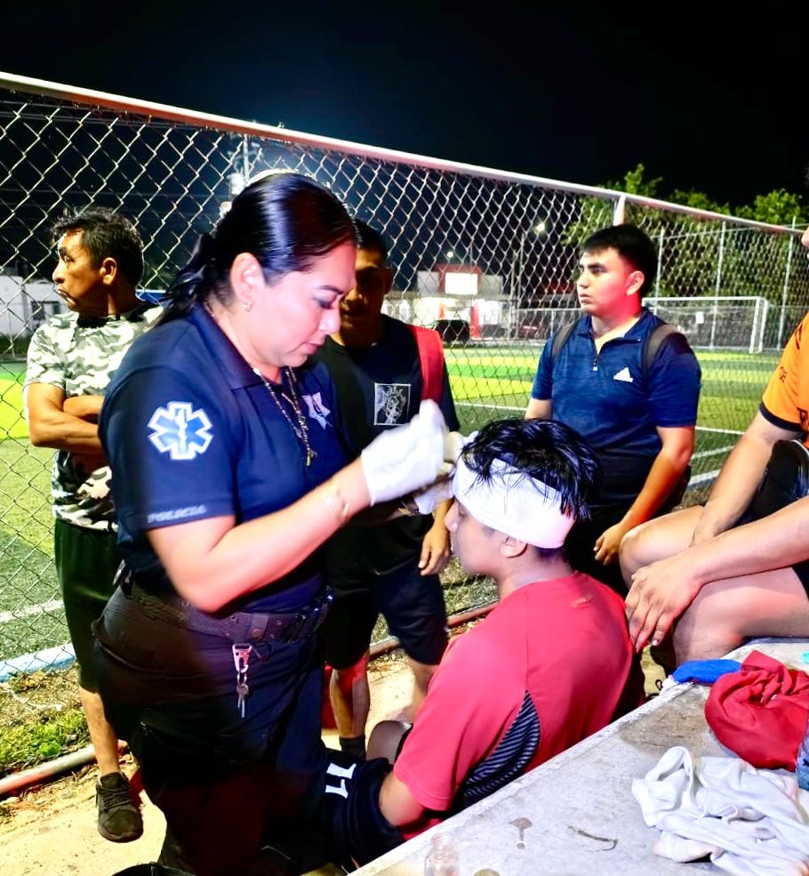 Inicio / Destacada policía / Paramédicos de Kanasín atienden a futbolista que se pegó en la frente con poste metálico