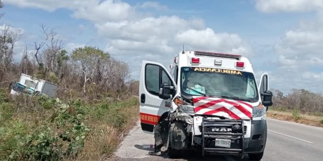 Tecoh, Yuc. a 3 de abril.- Un tremendo accidente dejó como saldo a dos paramédicos de la Secretaría de Seguridad Pública (SSP) heridos la tarde de ayer, cuando la ambulancia Y-44 en la que viajaban, colisionó contra un camión de materiales en el tramo carretero Mérida-Chetumal a la altura de Telchaquillo.