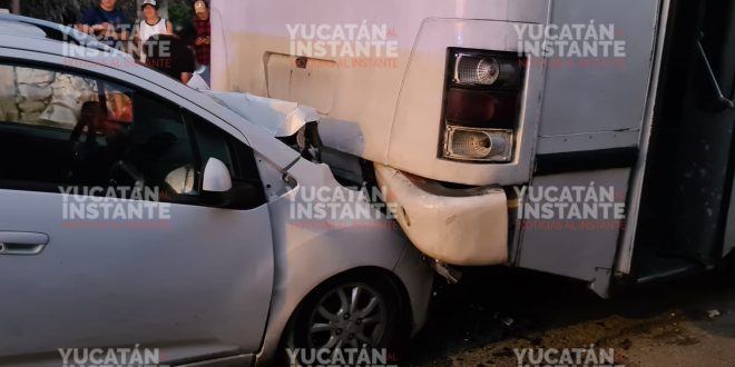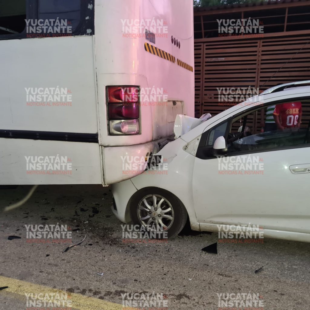 Kinchil, Yuc., a 20 de agosto.- Vaya sobresalto tuvieron empleados de una granja porcícola que abordaban un autobús a su centro de trabajo, al escuchar un seco guamazo, debido a que un vehículo Spark se aporreó en la parte posterior de esa pesada unidad.