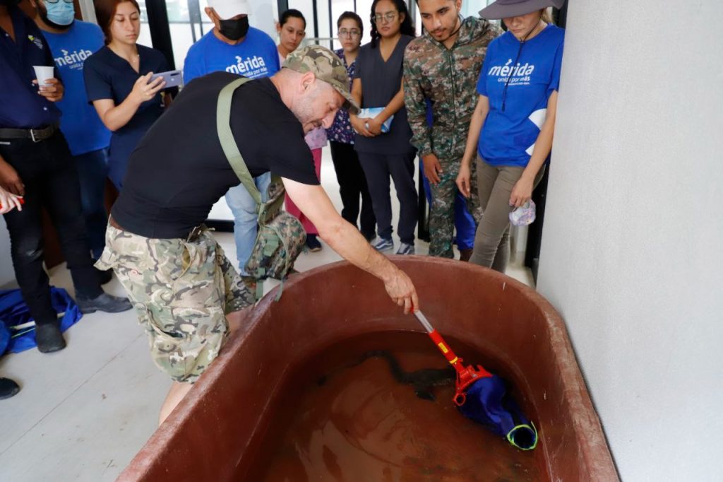 Mérida, Yucatán a 8 de agosto de 2022.- Con el objetivo de actualizar los conocimientos del personal de los zoológicos, el Ayuntamiento de Mérida que encabeza el Alcalde, Renán Barrera Concha, fortaleció las habilidades del equipo de veterinarios, biólogos y guardanimales a través del curso teórico-práctico “Maniobras de contención en cocodrilos” que impartió el especialista británico Peter Prodromou.
