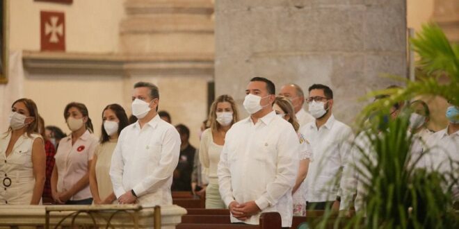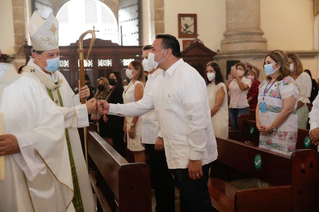 La misa contó con la asistencia de la abogada María Fritz Sierra, secretaria de Gobierno en representación del gobernador Mauricio Vila Dosal, así como de numerosas personas quienes participaron en la homilía conservando la sana distancia.
