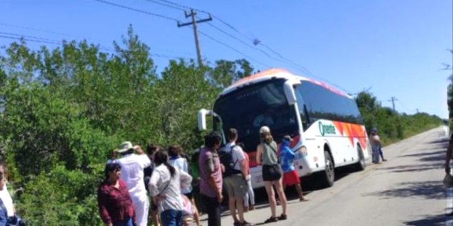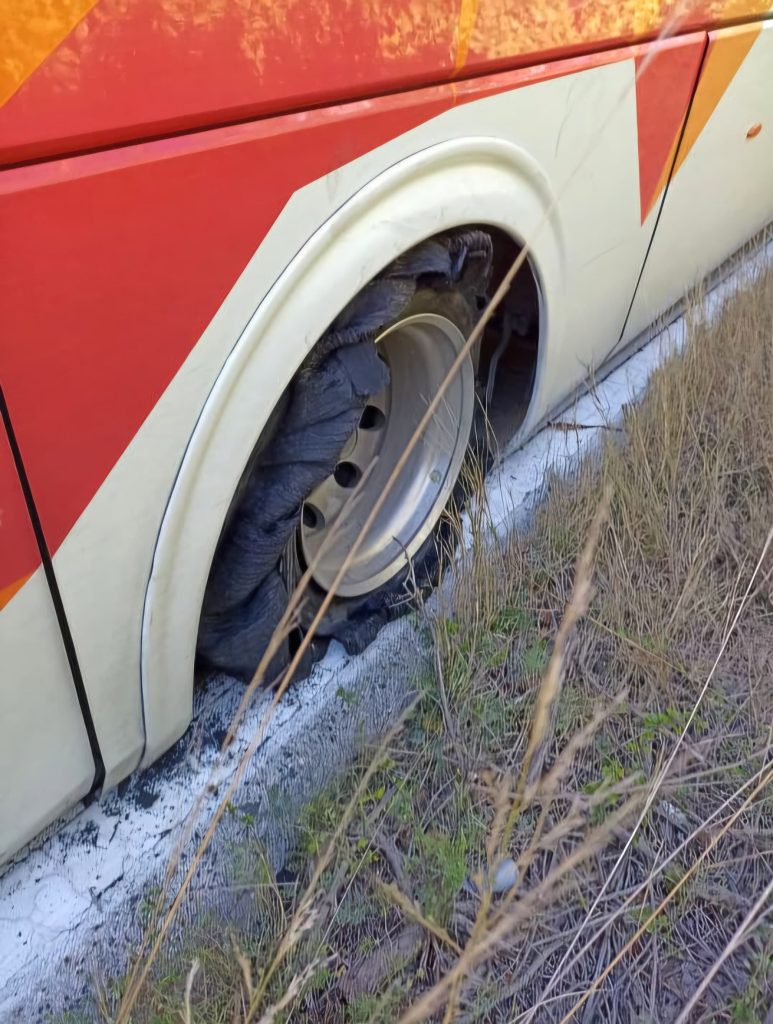Celestún, Yuc. a 25 de febrero 2025.- Con el Jesús en la boca quedaron algunos pasajeros de un autobús de Oriente esta mañana, cuando una de sus llantas se ponchó en plena marcha mientras circulaban en el tramo Celestún-Kinchil.