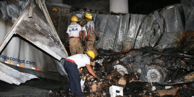 A pesar de que utilizó su extinguidor y el de una pipa que pasaba en ese momento, no pudo controlar las llamas. Las llantas traseras estallaron y de ahí el fuego “saltó” hacia la mercancía, la cual fue pérdida total.