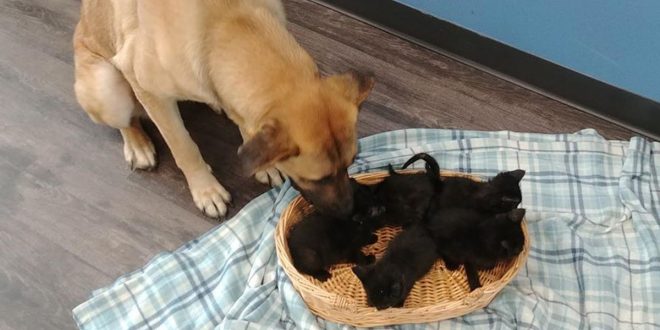 No está claro cómo o qué unió a la perra y los gatitos de cinco semanas de edad.