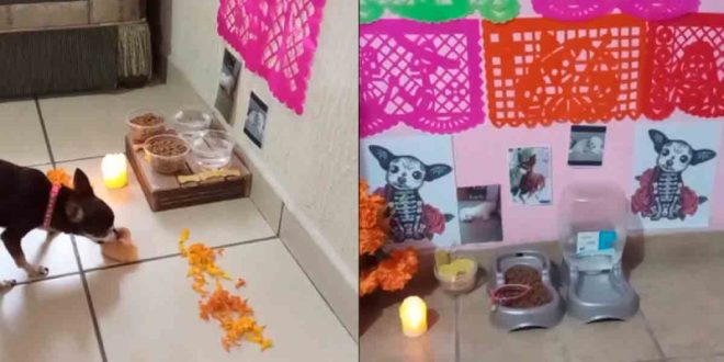Posteriormente, en el mismo video se observa como este año las fotografías de la mascota ya aparecen en la ofrenda de Día de Muertos en donde su dueña colocó croquetas y por supuesto su pan de muerto favorito para que pueda disfrutarlo, ahora como un alma que visita el mundo de los vivos.