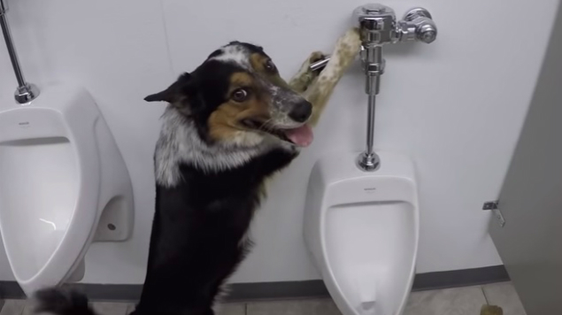 Se hace viral el video de un perro haciendo del baño dentro del sanitario público e incluso jalando la palanca.