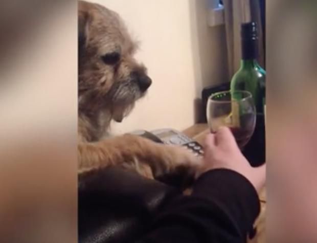 En redes sociales se difundió el video de un perro que le impide a su dueño agarrar una copa de vino.
