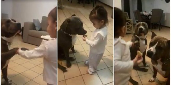Además, papá de la niña le da galletas para premiar a los perros. Posteriormente, las mascotas comen los bocadillos de manos de la menor, sin lastimarla.