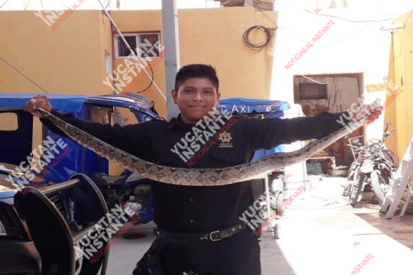 Don Amilcar al ver la impresionante boa, habló a la Policía Municipal, cuyos elementos “arrestaron” al animal de metro y medio de largo, siendo el encargado el oficial Isael Puc Caamal.