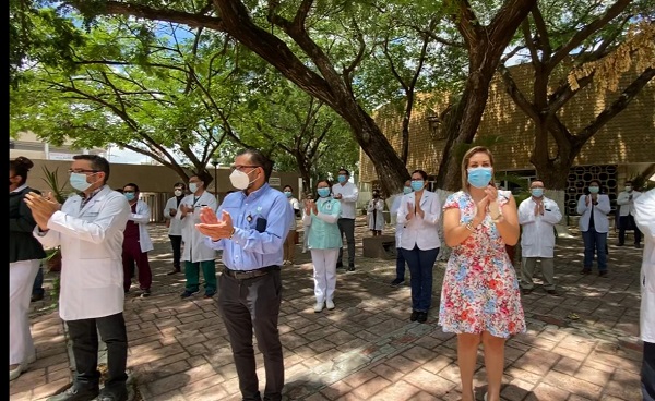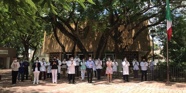 El director general del Instituto Mexicano del Seguro Social (IMSS), Zoé Robledo, directores normativos, titulares de las oficinas de representación en las 32 entidades del país y trabajadores, guardaron un minuto de silencio en memoria de las personas fallecidas por COVID-19 y brindaron un minuto de aplausos para reconocer el trabajo del personal de salud que hace frente a esta emergencia sanitaria.