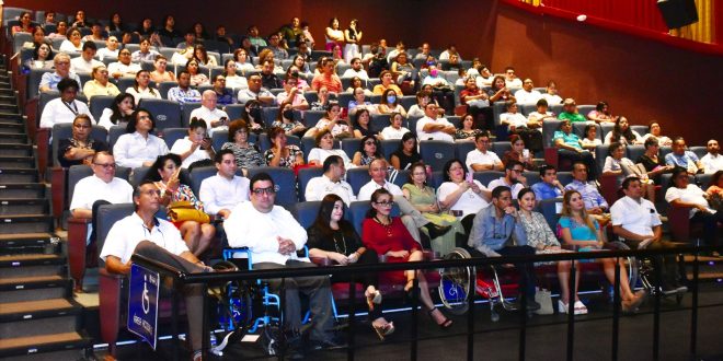 En la Sala 2 de los Cines Siglo XXI, Juan de la Cruz Canché Várguez, persona con discapacidad visual; María Naicy Nájera Solís, madre de dos mujeres con discapacidad auditiva; Nidia Margarita López Castellanos y su hija, Michell Rosas López, adolescente con discapacidad intelectual; Mauricio Casares Castro y Rosa Marlene Cahun May, personas con discapacidad motriz; estuvieron en la mesa principal moderada por Verónica Edith Rosas Ortega de la asociación Paso a Pasito IAP.