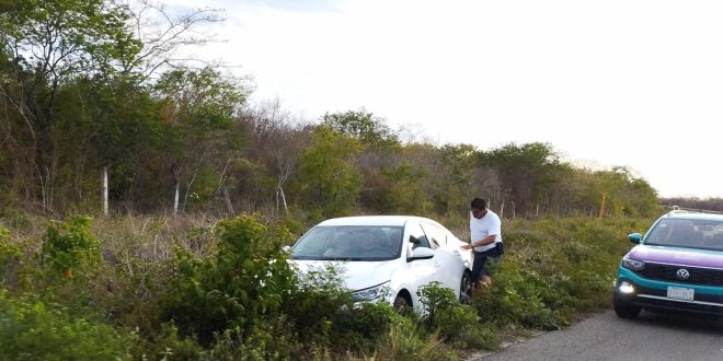 Hunucmá, Yuc., a 29 de junio 2023.- Después de disfrutar el mar, el guiador veterano de un automóvil Nissan terminó fuera de la cinta asfáltica para acabar dentro los arbustos de dicha vía federal.