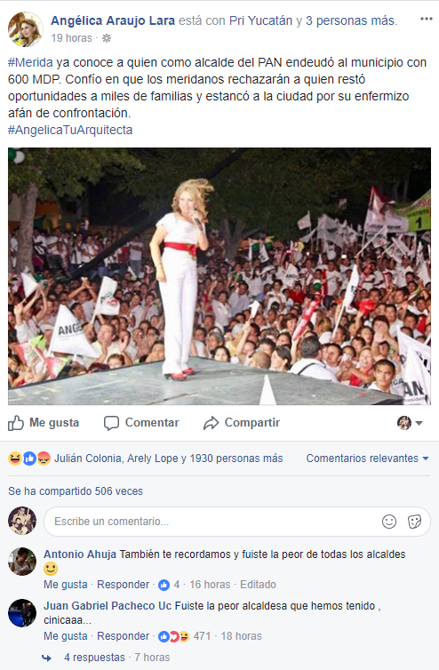 Luego de la designación del Partido Acción Nacional (PAN), a su candidato a la alcaldía de Mérida, Renán Barrera Concha, la diputada federal del Partido Revolucionario Institucional (PRI), Angélica Araujo Lara, manifestó su rechazo en sus redes sociales tachando al pre candidato de haber endeudado a Mérida.