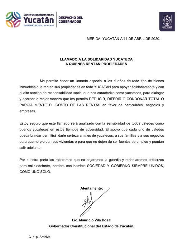Mérida, Yucatán, 11 de abril de 2020.- Ante el reto financiero al que se enfrenta el estado por la pandemia del Coronavirus, el Gobernador Mauricio Vila Dosal hizo un llamado especial a los dueños de todo tipo de bienes inmuebles que rentan sus propiedades en todo Yucatán para, en la medida de lo posible, reduzcan, difieran o condonen total o parcialmente el costo de las mensualidades en favor de particulares, negocios y empresas.