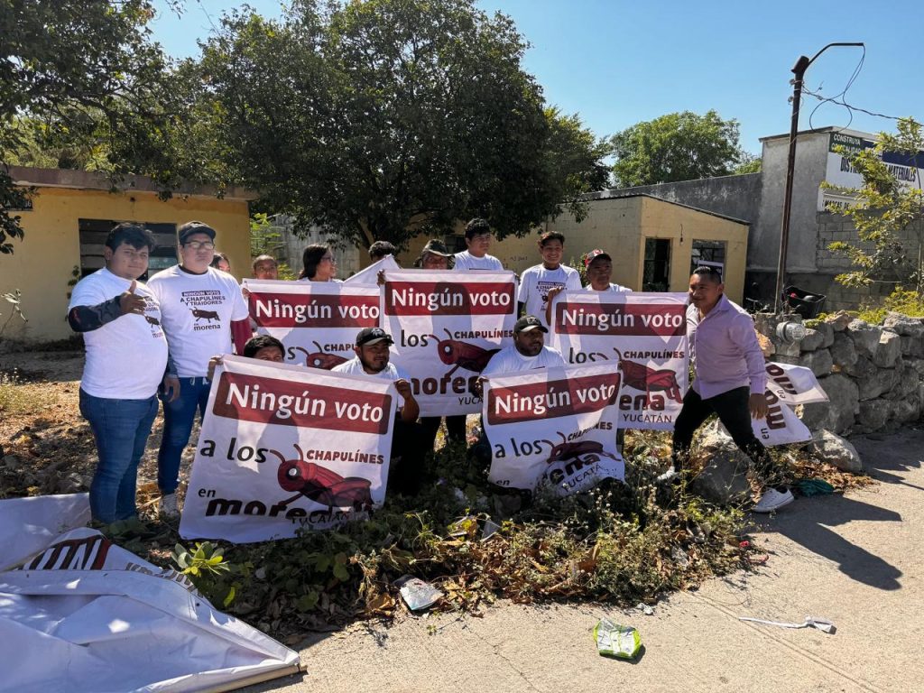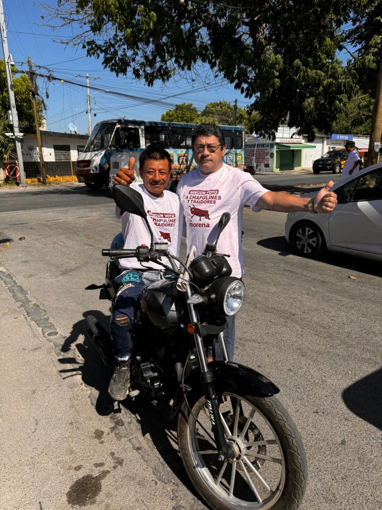 En el recorrido que hicieron por las casas y en pláticas con ciudadanos y conductores que estaban en la zona, para informar a la sociedad sobre las razones por las cuáles no deben votar por “los traidores” que ponen en riesgo al movimiento guinda en Yucatán e insistieron en que deben dar ni un voto a los “chapulines” porque representan un riesgo para la 4T y también para Yucatán.
